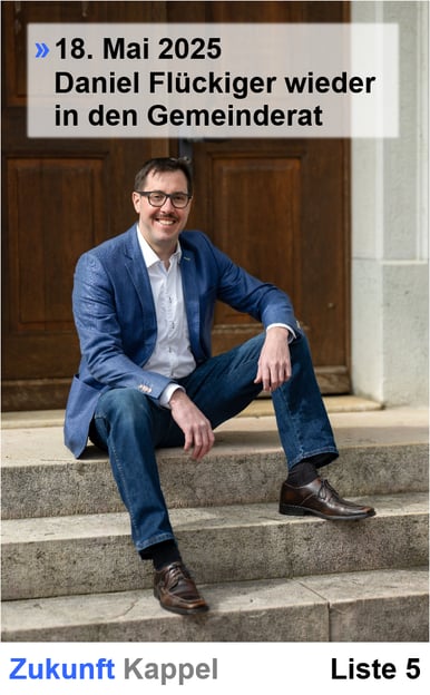 Am 18. Mai 2025 finden Gemeinderatswahlen statt. Wir empfehlen Ihnen unseren bisherigen Gemeinderat Daniel Flückiger zur Wahl. Unterstützen sie Daniel und Zukunft Kappel, damit unser Dorf attraktiv bleibt.
